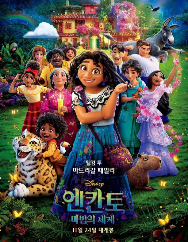 2021년에 개봉한 '엔칸토 : 마법의 세계'는 월트 디지니 애니메이션 스튜디오의 60번째 뮤지컬 영화이다. 콜롬비아의 마법의 힘을 가진 가족의 이야기로 '엔칸토'는 초인적인 힘, 치유하는 힘 등 저마다 특별한 기적의 능력을 가지고 태어나지만 그렇지 못한 '미라벨'은 가족들이 어떤 역활도 주지 않았고, 위험에 처한 '엔칸토'를 구하려는 미라벨과 가족들의 이야기이다.