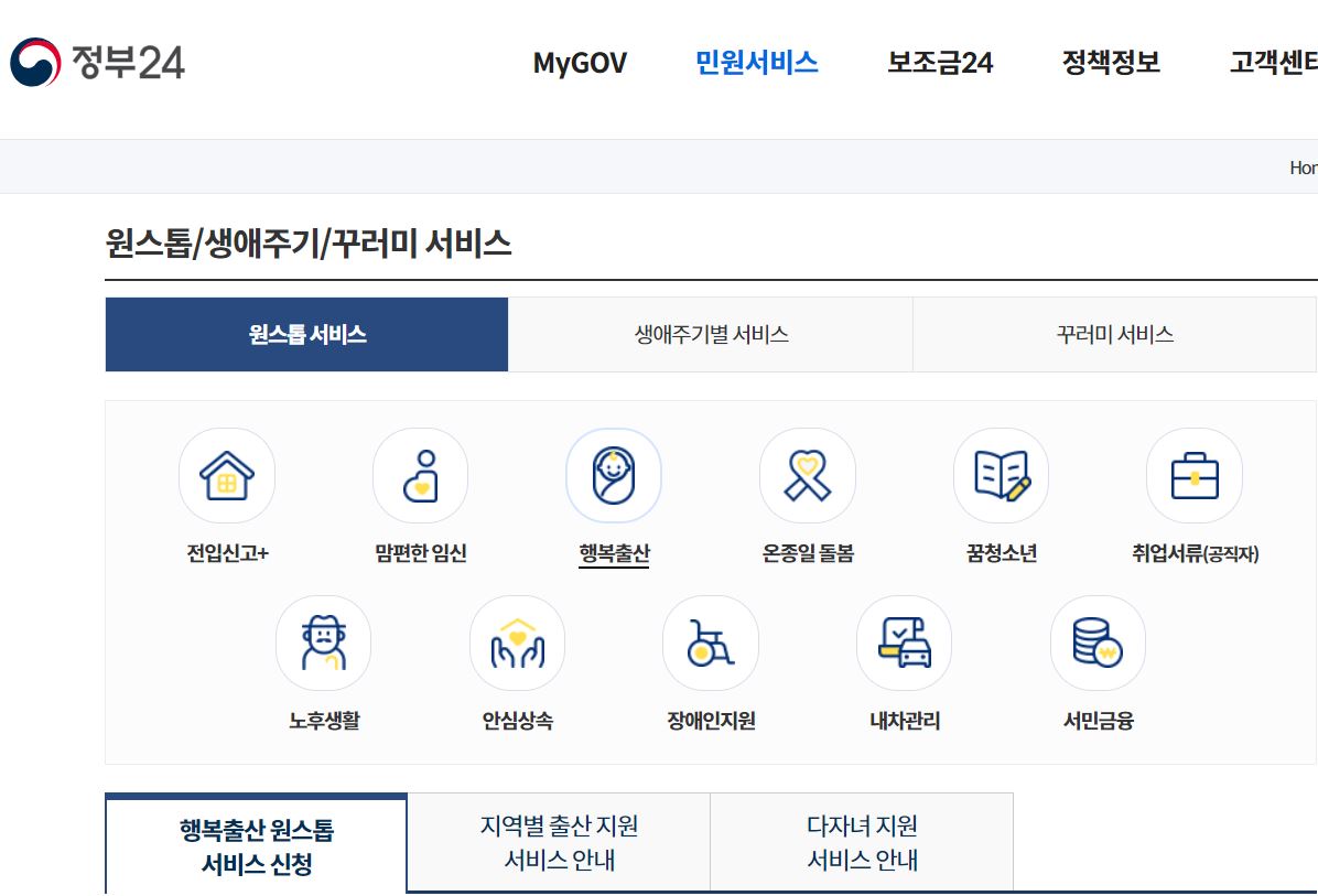 - 행복출산 원스톱 서비스에 의해 출산서비스 통합 처리 신청서로 신청가능
