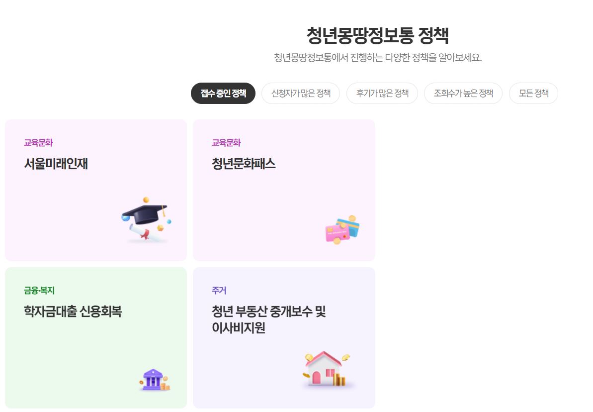현재 서울시에서 진행중인 정책을 볼 수있어요. 그 중 교육문화> 청년문화 패스를 신청합니다.