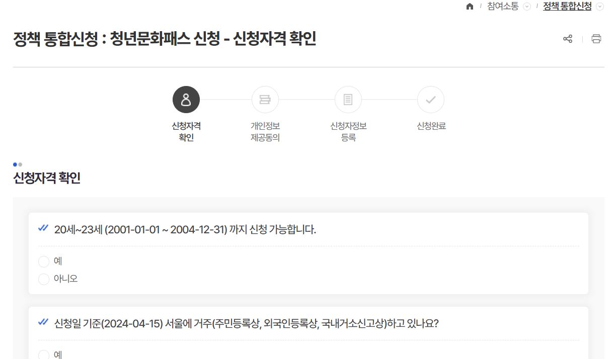 신청 자격에 대한 질문을 질의 응답형식으로 체크를 하면 다음으로 넘어갈 수 있어요
