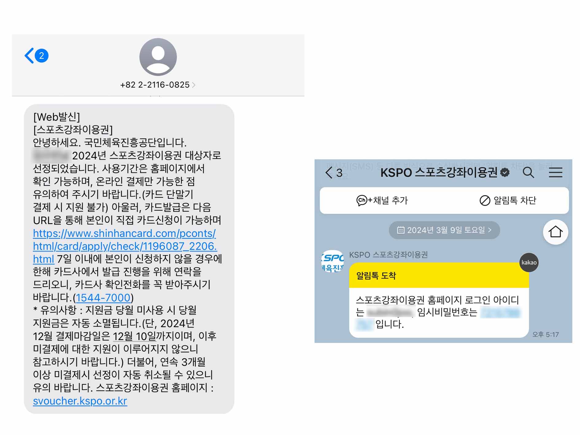 카드 신청 문자 메시지와 스포츠강좌이용권 임시비밀번호 메세지